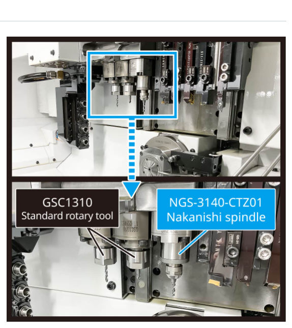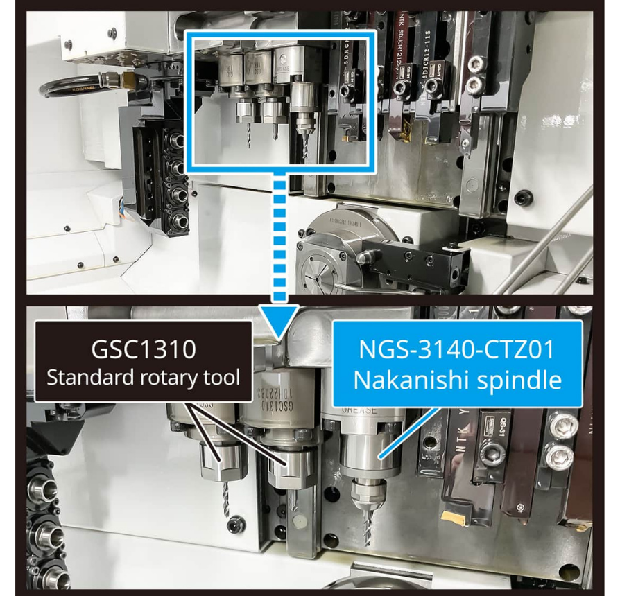 Bu iş mili, CNC otomat tezgahının canlı takım ünitesine monte edilerek, canlı takım dişli kutusundan tahrikle döner. Geleneksel döner takımlara kıyasla, maksimum 4,3 kat devire ulaşır. CNC otomat tornaların işleme aralığını maksimum düzeye çıkarır. Bu ürün Nakanishi’nin gelişmiş motor iş mili teknolojisine sahiptir.